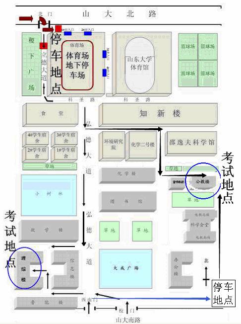 友情提示:山大南路、山大北路两侧不允许停车,校内停车资源有限,建议广大考生减少开车赴考。如有开车的考生,请由中心校区北门或西南门进出校门,将车停放在体育场地下停车场、东南角停车场等允许停车区域。